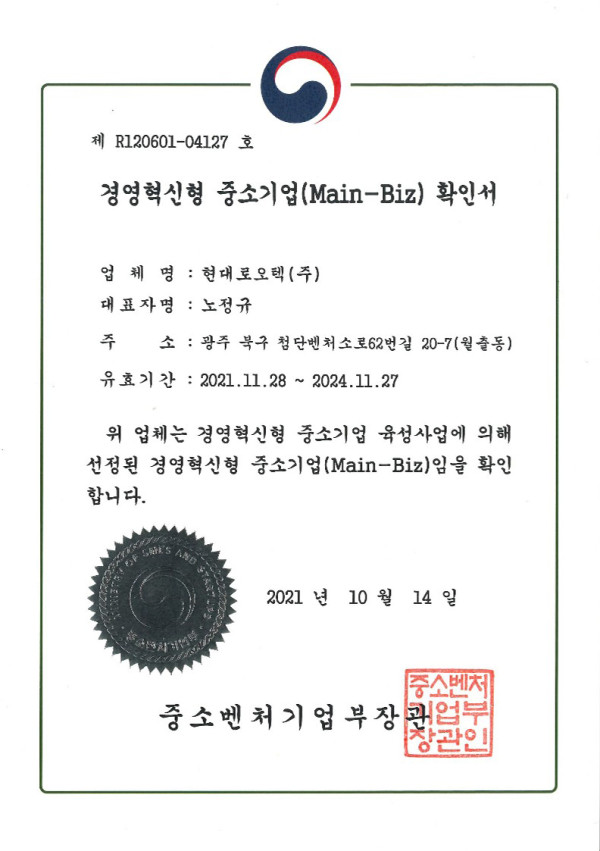 인증서 경역혁신형 중소기업 확인서