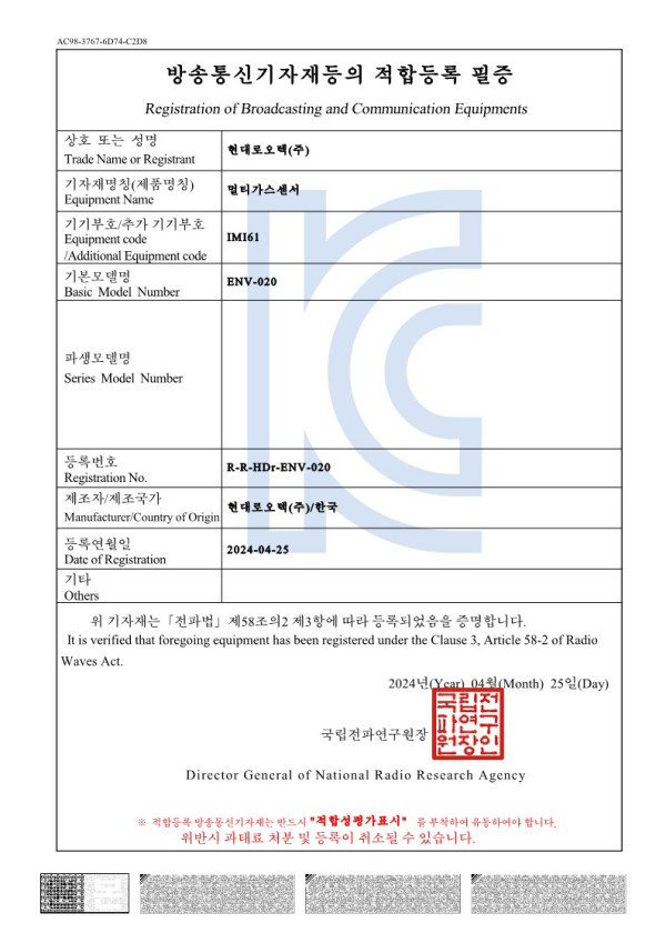 ENV-020 멀티가스센서_방송통신기자재등의 적합등록필증 > 인증서